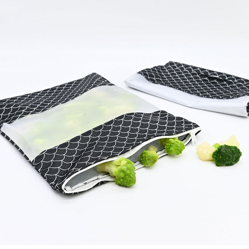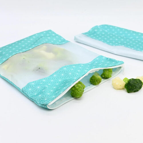 Nos petits sacs réutilisables sont en tissu PUL. Ils sont hermétiques et se ferment facilement grâce à leur fermeture éclaire. Ils conserveront vos aliments pendant plusieurs mois dans le congélateur.